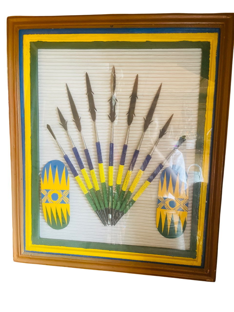 This is a framed traditional African warrior art featuring eight spears arranged in a fan shape, flanked by two decorated shields. The bold yellow, green, and blue colors symbolize unity, strength, and protection, while the spears represent bravery and readiness to defend the community. It is a striking cultural décor piece that celebrates heritage and warrior pride.