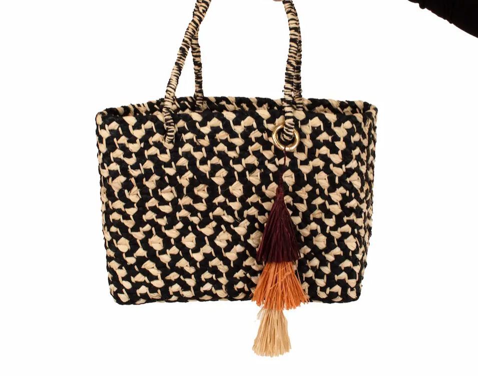 Handwoven Raffia Tote Bag with Tassel – Black & Natural Artisan Basket Bag
