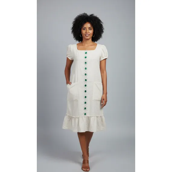 Elegant and effortlessly feminine, this modern Habesha-inspired midi dress blends traditional charm with contemporary style. Designed with a flattering square neckline and soft puff sleeves, it creates a graceful silhouette perfect for both casual and semi-formal occasions. The front button detail adds a stylish touch while enhancing the dress’s classic appeal. Made with a comfortable, lightweight cotton fabric, the A-line fit allows easy movement and a flattering shape. Pair it with heels or sandals for a polished, timeless look.