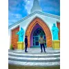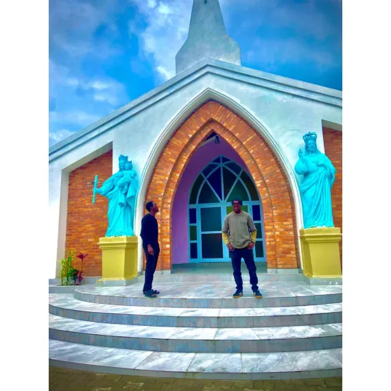 A graceful statue of Our Lady of Fatima, featuring the Virgin Mary dressed in flowing white garments, crowned and holding a rosary. The peaceful expression and gentle posture reflect her message of prayer, repentance, and peace delivered during the Fatima apparitions in 1917.
