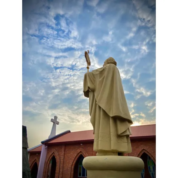 A devotional statue of Saint Charbel Makhlouf, depicted in his monastic habit with a humble, prayerful posture. The sculpture reflects his life of solitude, faith, and miracles, symbolizing spiritual healing, dedication to prayer, and deep Christian devotion inspired by the Lebanese Maronite tradition.