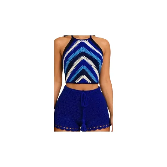 Handmade Crochet Two-Piece Set – Blue Wave Halter Top & High-Waist Shorts