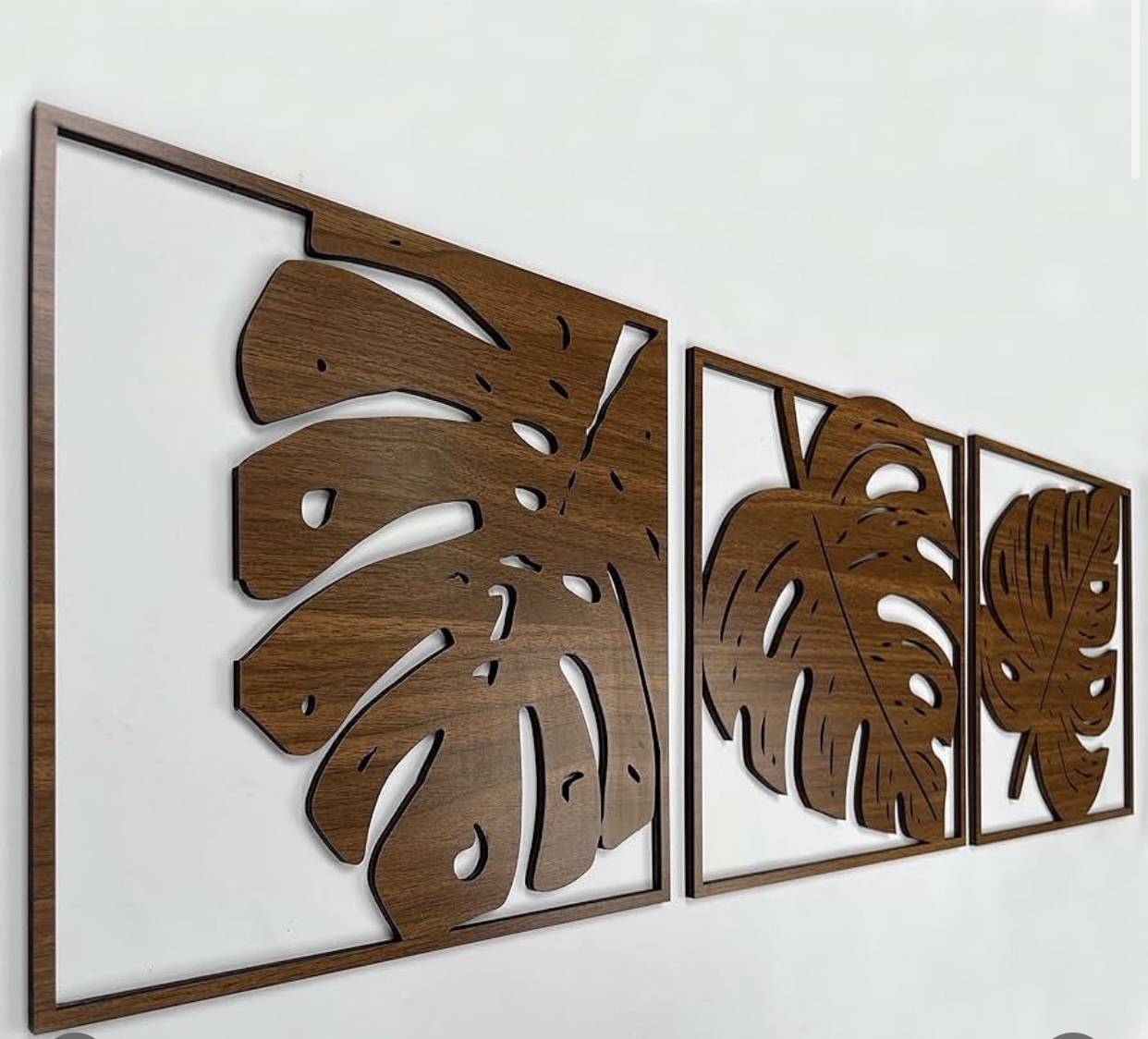 This unique set of three wall art panels features intricate Monstera leaf designs, bringing a touch of nature and a vibrant tropical vibe indoors. Crafted from high-quality, durable wood with a rich, dark walnut finish, each piece highlights the natural beauty and unique texture of the material. These openwork decorative panels are easy to install and create a modern, elegant aesthetic in any living room, bedroom, or office space