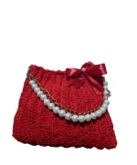 Handmade Red Crochet Handbag with Pearl Chain & Ribbon Bow – Elegant & Unique