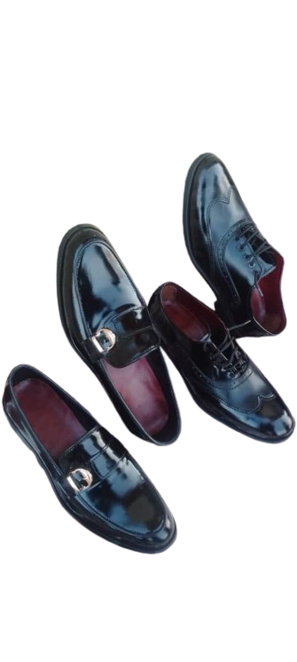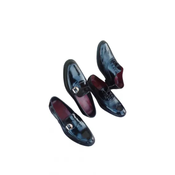 This stylish pair includes two types of black patent leather formal shoes - sleek loafers with a silver buckle detail and classic lace-up dress shoes. Both feature shiny black patent leather exteriors and rich maroon interiors for a touch of elegance.